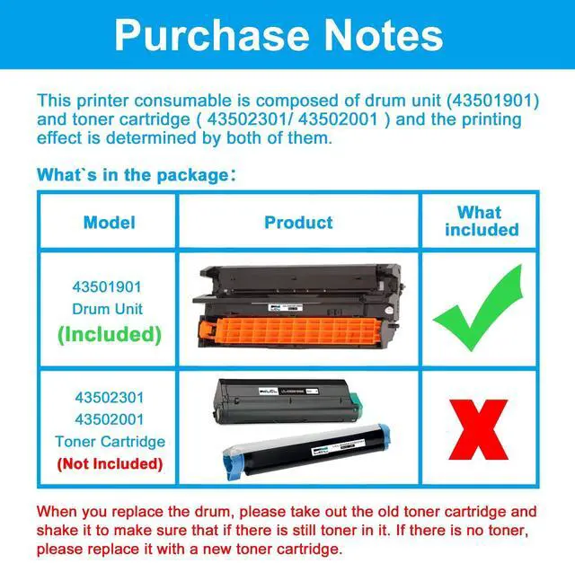 Purchase Notes: This is a drum unit only, toner cartridge is sold separately; When you replace the drum, please take out the old toner cartridge and shake it to make sure that if there is still toner in it. If there is no toner, please replace it with a new toner cartridge.
