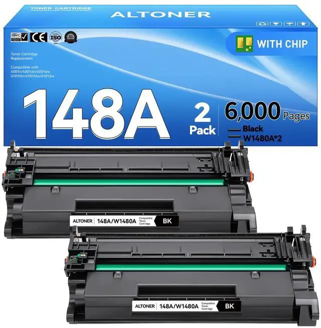 Exact Toner CapacityPrecision-engineered to match 148A toner levelsprevents printer damage from under/overfilling ^^ Guaranteed CompatibilityWorks with Laser Jet Pro 4001n 4001dn 4001dw 4101fdn 4101fdwn 4101dw ( NOT for ends in e models) ^^ High Page YieldUp to 3, 000 pages per W1480A 148A Black Toner Cartridge, Total 2 set 148 ^^ 6, 000 Pages ^^ Including Latest ChipAfford real-time supply levels, Intelligent reminder to replace 148a toner cartridges and extend printer using life ^^ Better Price, Lower RiskSave 60% printing cost per document with 148A Black replacement