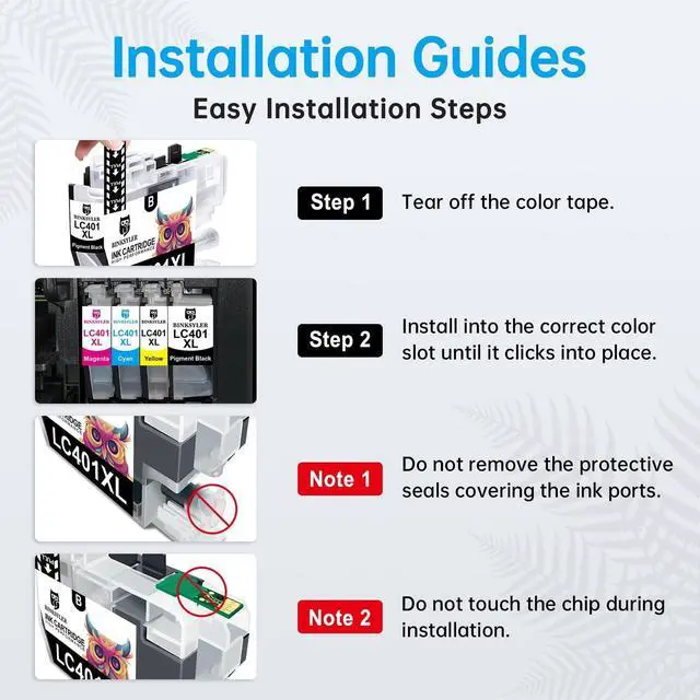 Installation Tips: [1] Don't remove or touch the CHIP. [2] When the printer prompts "non-original", please click OK or Next to continue. [3] When the printer appears "low ink", "empty", "replace ink cartridge" and other prompts, please remove the ink cartridge and reinstall it several times.