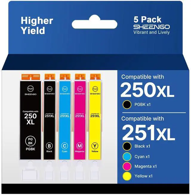Package Contents: Total 5 packs for 251 printer ink cartridges, 1 x Large Black 250XL ink cartridge, 1 x Small Black 251XL ink cartridge, 1 x Cyan 251XL ink cartridge, 1 x Magenta 251XL ink cartridge, 1 x Yellow 251XL ink cartridge