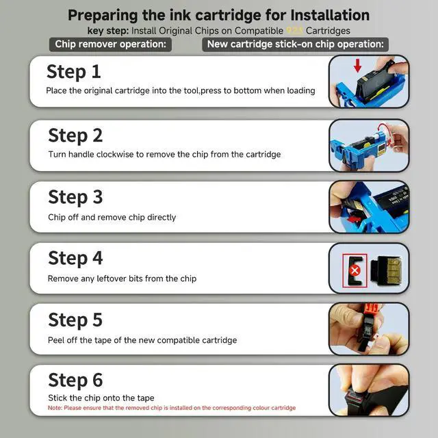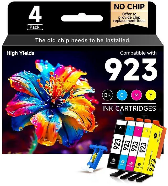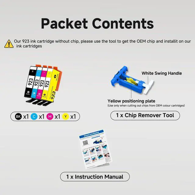 ^^ No Chips: Our 923 ink cartridges combo pack is without chip, and you need to keep the old chips and install them to drive the whole set of 923 ink cartridges. The ink cartridges equipped with a chip remover tool and instruction, easy to operate and use. ^^ How to Remove the OEM Cartridge Chip and Install It onto the Compatible 923