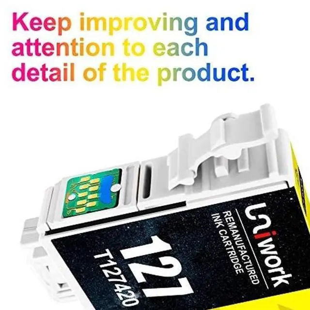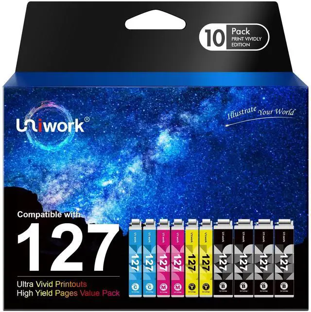 ^^ Package Contents: 4 Large Black for epson 127 Ink Cartridges, 2 Cyan for epson 127 Ink Cartridges, 2 Magenta for epson 127 Ink Cartridges, 2 Yellow for epson 127 Ink Cartridges ^^ Uniwork 127 Ink Cartridges Produces with brilliant color and sharp black prints.