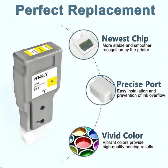 ^^ Premium Quality: This pfi 320 ink cartridge provides the most vivid intense colors, rich colors, can make the pattern more realistic and interesting. Extremely stable, does not appear cracking and fading. Don't worry about clogging, make printing smoother ^^