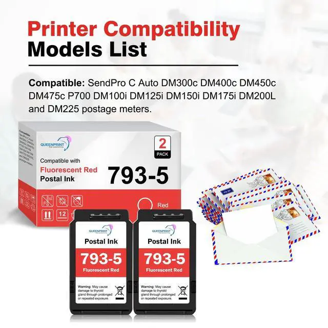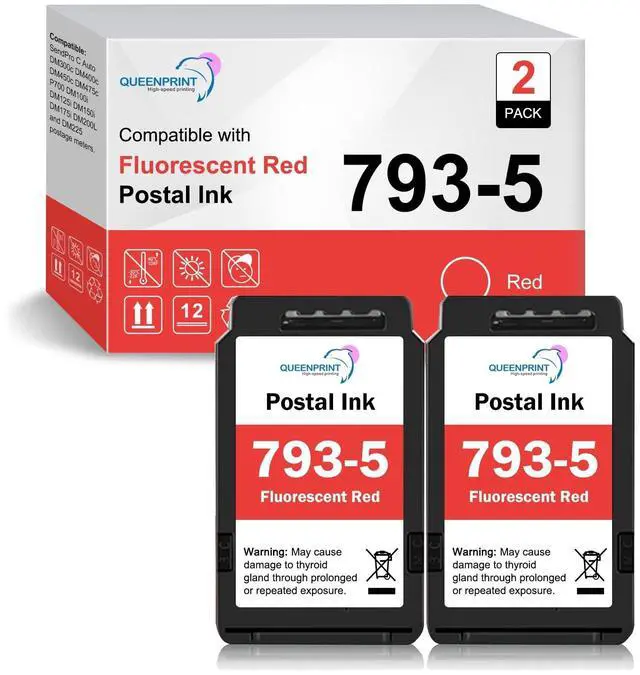 The QueenPrint 793-5 Red Postage Ink Cartridge is a high-quality replacement for Pitney Bowes 793-5 and SL-793-5 ink cartridges. Each cartridge contains 35ml of premium red fluorescent ink designed for consistent, professional postage printing. With this 2-Pack of 793-5 ink, you can produce up to 10, 000 sharp and legible impressions per cartridge, ensuring long-lasting performance and vibrant red color on every envelope. Compatible with Pitney Bowes SendPro C Auto, DM300C, DM400C, DM450C, DM475C, P700, DM100i, DM125i, DM150i, DM175i, DM200L, and DM225 postage meters, these ink cartridges are easy to install and deliver smooth, even ink flow without clogging or fading.