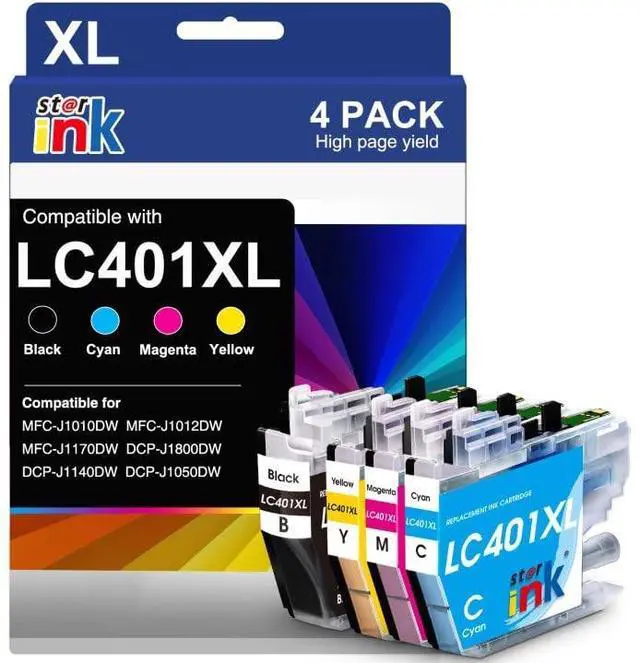 Package contents: total 4 pack compatible for brother lc401XL ink cartridges, 1 x Black LC401 XL, 1 x Yellow LC401 XL, 1 x Cyan LC401 XL, 1 x Magenta LC401 XL ^^