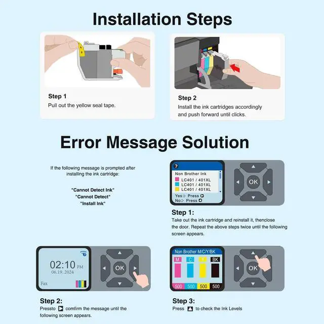 Warm Tip: If prompted for this Printer error "cartridge not recognized", "The printer does not have enough ink", Please reinstall the cartridge to turn it off and on once until it is recognized; When the printer prompts "non-original", please click OK or Next to continue