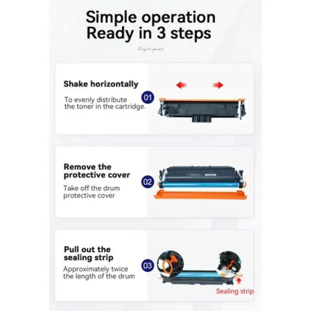 INSTALLATION GUIDE: Remove the protective sealing tape from inside the toner cartridgeCarefully detach the orange protective caps from the edgesRemove the protective cover from the roller assemblyGently shake the new cartridge horizontally 5-6 times to distribute toner evenlyPRODUCT