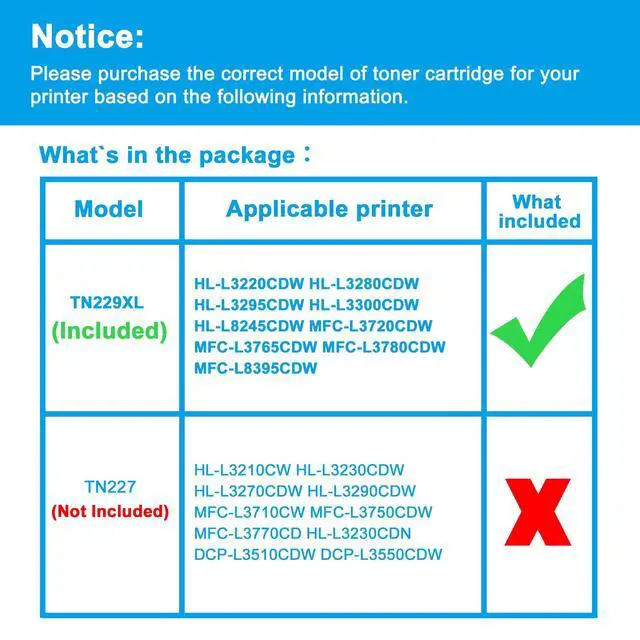 Reliable Quality: LCL TN229XL cartridge uses high quality toner, toner particle size distribution, good mobility, high transfer rate, resulting in a clear image and high gloss print effect; Printing efficiency is high, waste powder rate is low, so as to ensure sufficient page yield.