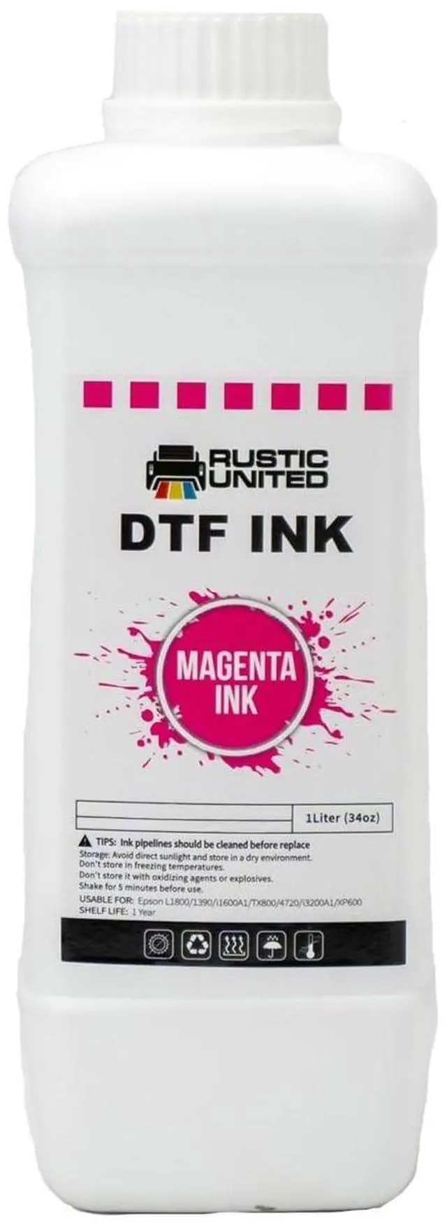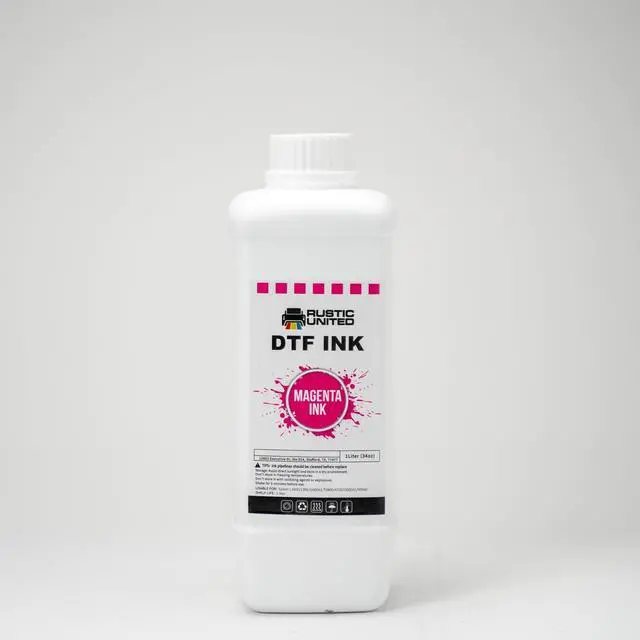 Rustic United Premium DFT Ink is specifically formulated for creating vibrant, high-quality direct-to-film (DTF) prints that can be heat-transferred onto a variety of materials, including cotton, polyester, nylon, leather, hoodies, aprons, tote bags, and more. This non-toxic, water-based ink delivers sharp, clear designs and a solid base, ideal for adding vivid detail to your projects. Benefits of