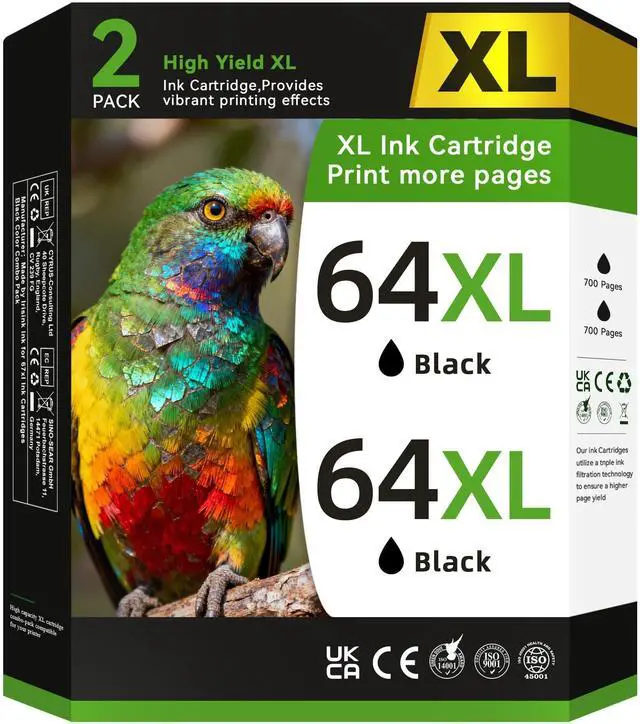 HP Printers: Includes 2 for hp 64xl black ink cartridge for hp printers, a high-value two-pack with truer, more natural-looking ink results and sharper printed text for uninterrupted printing. ^^ High Yield 64XL