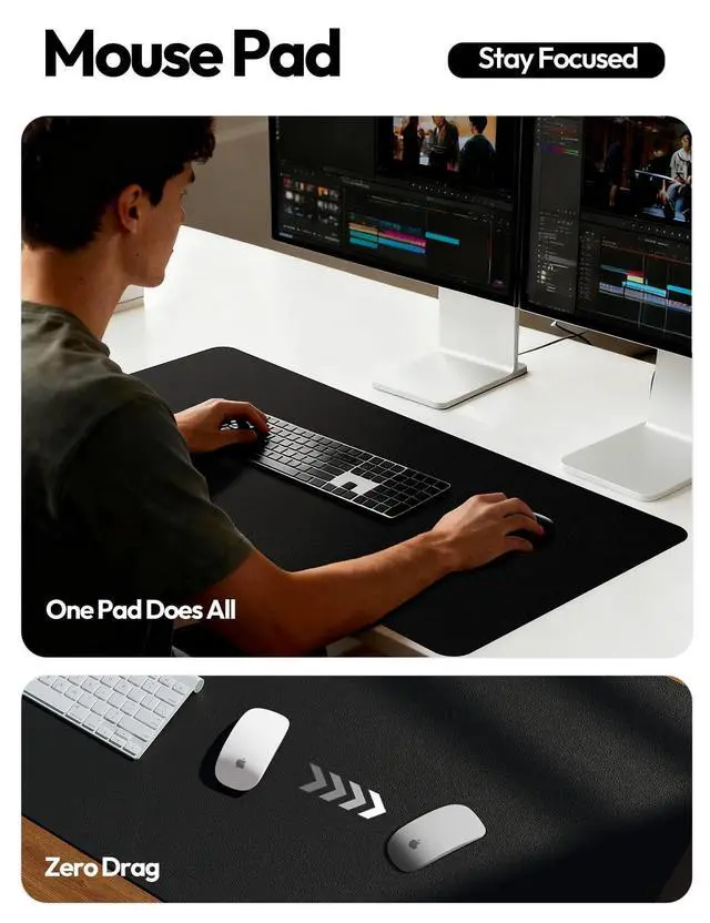 ^^ LARGE MOUSE PAD: With our large desk pad, say goodbye to small extra mouse pad. Make your desk top looks tiny and professional. With special suede design for back side, increase friction resistance with the desktop, Non slip. The friction resistance is increased by 71% than that of double-sided leather.