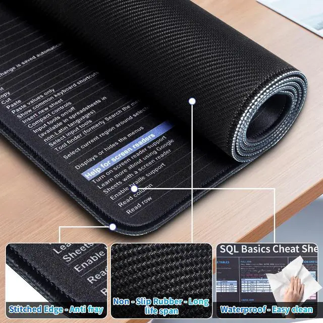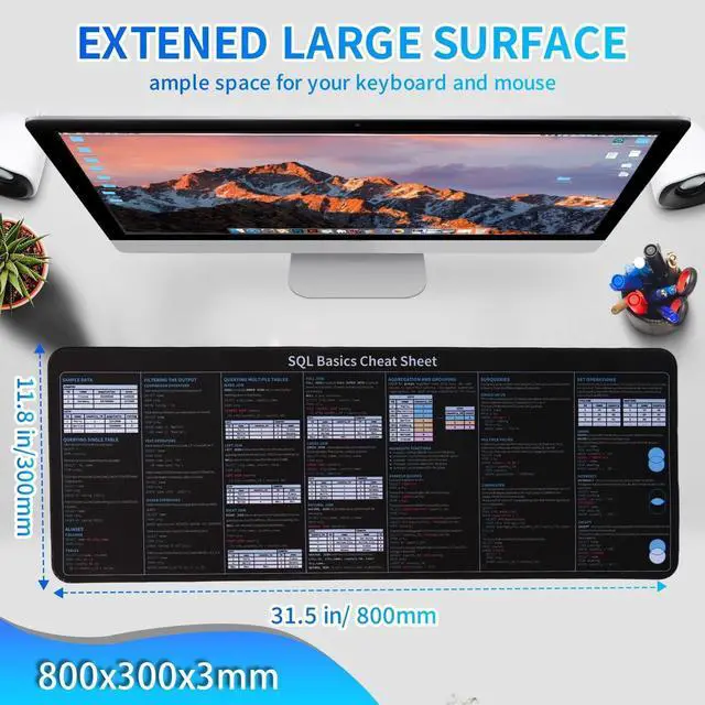 SQL Cheat SheetThe Large mouse pad with shortcuts specifically designed for SQL basics cheat sheet, making it easy for you to use SQL and improve work efficiency. ^^ HD PrintingThe extra large keyboard shortcut mousepad adopts high-tech printing process to ensure that the pattern of the mouse pad is clear and the color is bright. Ensuring users have quick and easy access to frequently used commands and functions. This is a great office accessories. ^^ Universal FitMouse Pad for Desk is designed for comfort and productivity. Measuring at 31.5 x 11.8 inches, it provides ample space to accommodate your mouse, keyboard, and other desk essentials.