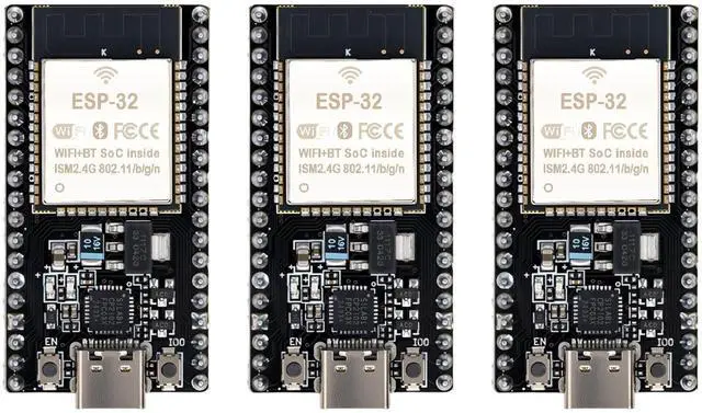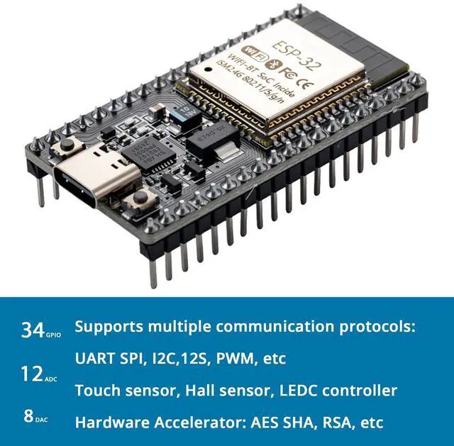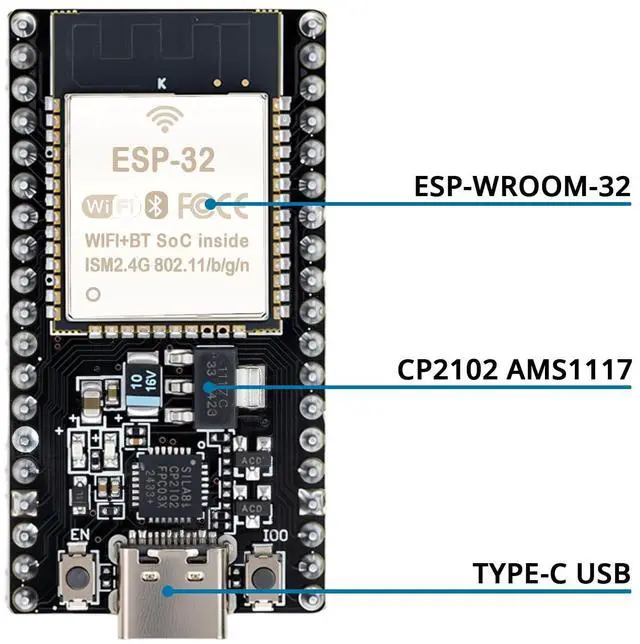 ESP32 CP2012 USB C (Type-C) core board, equipped with 38 pins, offering more functions compared to 30-pin modules. Its narrower width enables excellent connection to the breadboard. ^^ Integrated Components ESP32 integrates antenna, switch, RF balun, power amplifier, low noise amplifier, filter, and power management module. ^^ Supported Interfaces Supports multiple interfaces, such as UART/SPI/I2C/PWM/DAC/ADC, providing versatility for various applications. ^^ Wireless Capabilities Features 2.4GH z WiFi and Bluetooth dual-mode, with support for STA/AP/STA + AP modes and common AT commands, ensuring convenient usage.