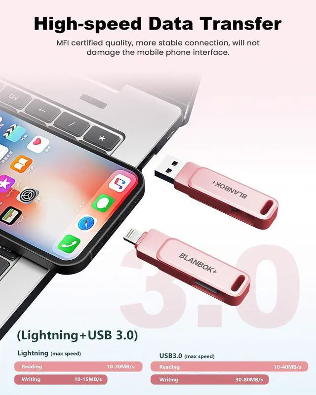 Flash Drive: The MFi-certified usb flash drive for iphone can ensure high quality, and also provide you with excellent performance, allowing you to store data more safely! Made of high-quality metal materials and advanced chip technology, it has excellent waterproof, dustproof, anti-drop, high temperature and anti-magnetic properties. The keychain design of the thumb drive also allows you to carry it with you to prevent loss.