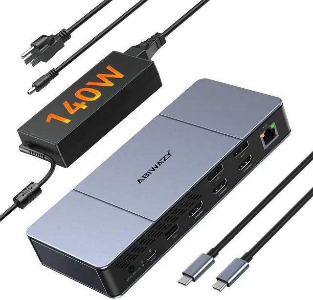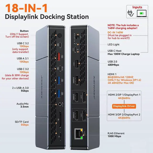 Macbook M1/M2/M3: ABIWAZY's displaylink dock with 140W power adapter expand 18 ports for daily use: 3*4K HDMI+2*4K DisplayPort+Button (ONLY Turn off the screen) +100W USB-C PD (Max) +140W DC power charging port+10Gbps USB C 3.2 Gen1 port(data & 30w output)+ Gigabit Ethernet+10Gbps USB C/A 3.2 Gen1 port (only data) + 2*USB A 3.0 + USB A 2.0 +MicroSD/TF card slots+ 3.5 mm Audio&Mic Jack.