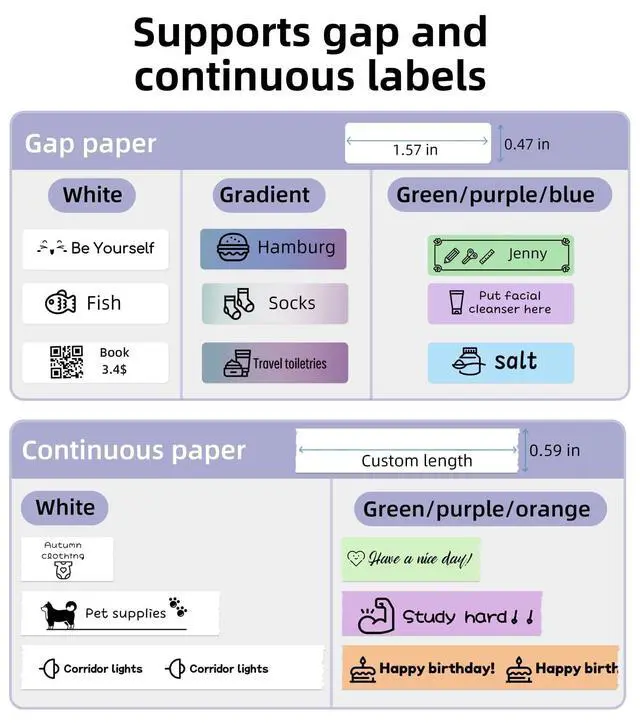 Multiple Creative Functions: The Snap & Tag app for this Bluetooth label maker provides various features and templates, easily create label stickers with text, QR codes, barcodes, materials, images, time, and borders; Customize label lengths with continuous tape, or use fixed-size labels for batch printing, featuring a built-in cutter for simple label cutting ^^