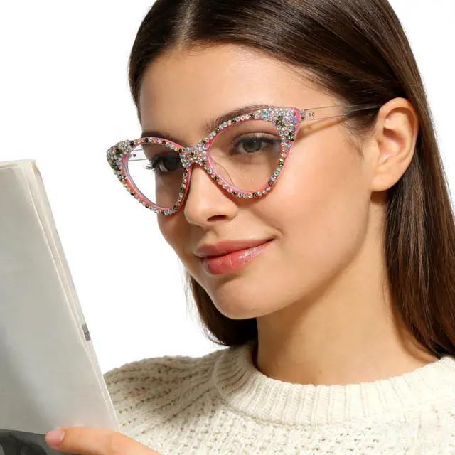 Bling Crystal Cat Eye Reading Glasses Women Rhinestone Eyewear Frames Anti Blue Light Reader with Spring Hinge, Rhinestone Blue Light Blocking Glasses for Women, Crystal Rhinestone Cat Eye Reading Glasses ^^ 100% brand new and high quality. ^^ Made of durable and lightweight TR90 material, comfortable to wear. ^^ The frame is designed in cat eye shape, which is very fashionable and suitable for various face shapes. ^^ The lens is made of high-quality clear plastic, with no distortion and no color difference.