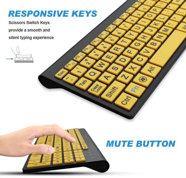 Large Print High contrast, large print keyboard offers increased visibility with easy to see yellow keycaps and crisp large print black letters. These high-contrast keys can really help those who have trouble seeing keyboards. Perfect for elderly, the visually impaired, schools, special needs departments and libraries, as well as companies. ^^ Full Size & Ultra-thin Keyboard 14.5 x 5.8 x 0.2 inch with 102 Keys. Scissor-key-switch Provides Smooth Typing and Sensitive Response, Low Profile keycaps and Quiet Mouse Button. ^^ Ergonomic Design Inclined angle, very comfortable to use it.