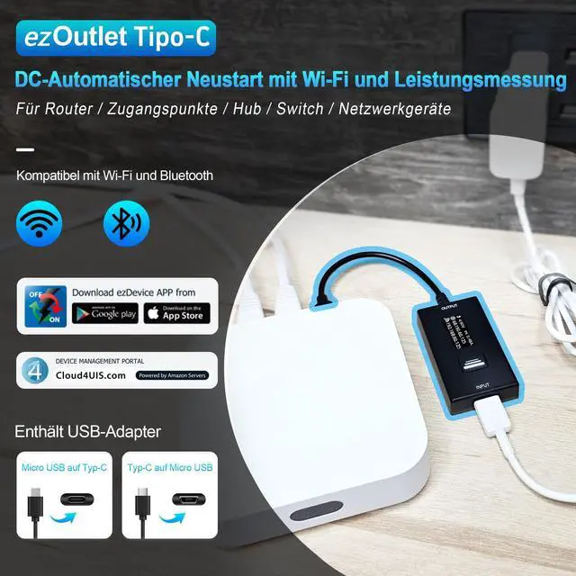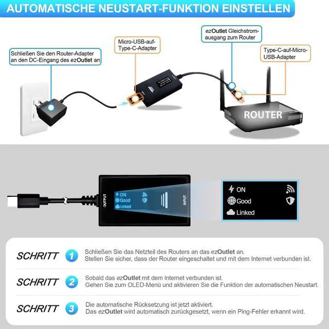 KEY FETURES & FUNCTIONALITY: Automatically Checks Internet Connectivity and Power Reset Device when Connection is Lost. Plugs Directly Into Your Existing Device's Power Input (Supports USB Type-C, Micro USB). Set Schedule to Power On, Off, or Reset Your Device. Integrated Power Monitoring. OLED Display for Information & Controls.