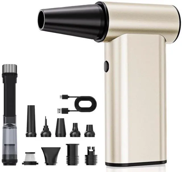 This electric air duster is the ultimate car detailing tool and dust remover for every task, from igniting campfires in camping, mini turbo snow blower for car in winter ^^ [Durable, Compact Electric Air Duster] Design for portability and durability! This ultra-compact ( 5.4" x 2.5" ) handheld small air blower is crafted from premium aluminum, making it a durable dust gun for cleaning. This mini air blower perfect as a mini vac for a tower fan or a car dryer air blower for quick spot drying. It easily stores in glove boxes as a ready mini duster for electronics or a handheld air compressor for inflatables.