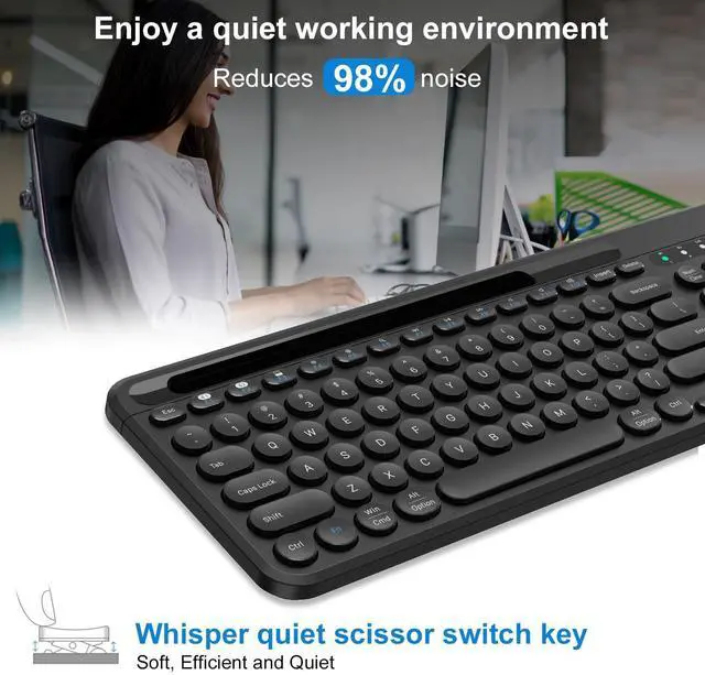 Effortlessly switch between three devices by pressing a single button. Light and responsive tactile keystrokes make typing soft, quiet, and comfortable. Upgraded chips and wireless technology provide a stable and reliable connection up to 33ft without any latency. ^^ Wide Compatibility - This office keyboard is suitable for computers/desktops/PCs/laptops, and the Mode Keyboard makes it a perfect choice for iPad, iPhone, iMac, MacBook, Laptop, PC, Tablets, Phone, Windows, iOS, Mac OS, Android.