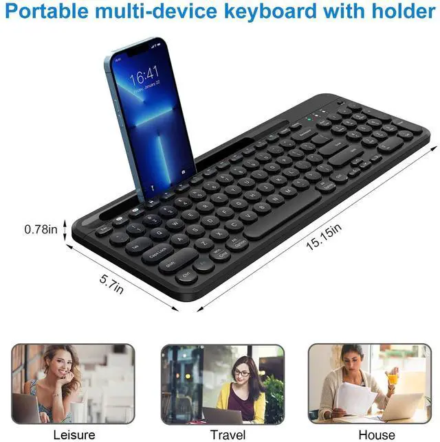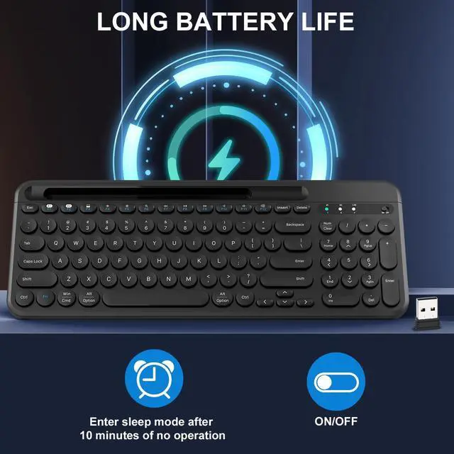 Ergonomic Keyboard - The computer keyboard features a U-shaped card slot with a length of about 8.15IN, suitable for storing devices such as smartphones. You can place it horizontally or vertically depending on the size of the smart device. With this card slot, you'll never miss any messages from your phone, since the built-in cradle can prop up your phone or tablet at a perfect angle to read or watch videos. ^^ Dual Mode Keyboard & LESS NOISE - The keyboards are designed in dual mode, allowing for three channels (keyboard channel * 2 + 2.4GH z USB keyboard channel * 1).