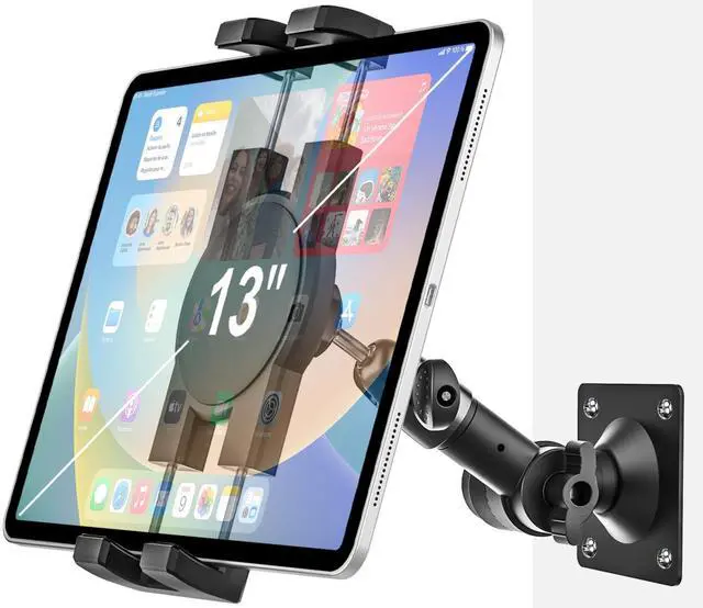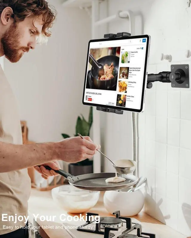Multi-Function Wall Mount Tablet StandThis practical multifunctional tablet stand can be used in many places in daily life, such as installing it in the bedroom, lobby, kitchen, for watching movies, studying, video recording, etc; It can also be installed in the company meeting room for meetings; It can also be used in many public places, such as cafes, school libraries, hospitals, bars, shops, bookstores, gyms, and so on. ^^ Stable Fixed Base with GearsGeared fixed base for better stability. The single arm is made of rust resistant aluminum alloy, which is sturdy and durable.