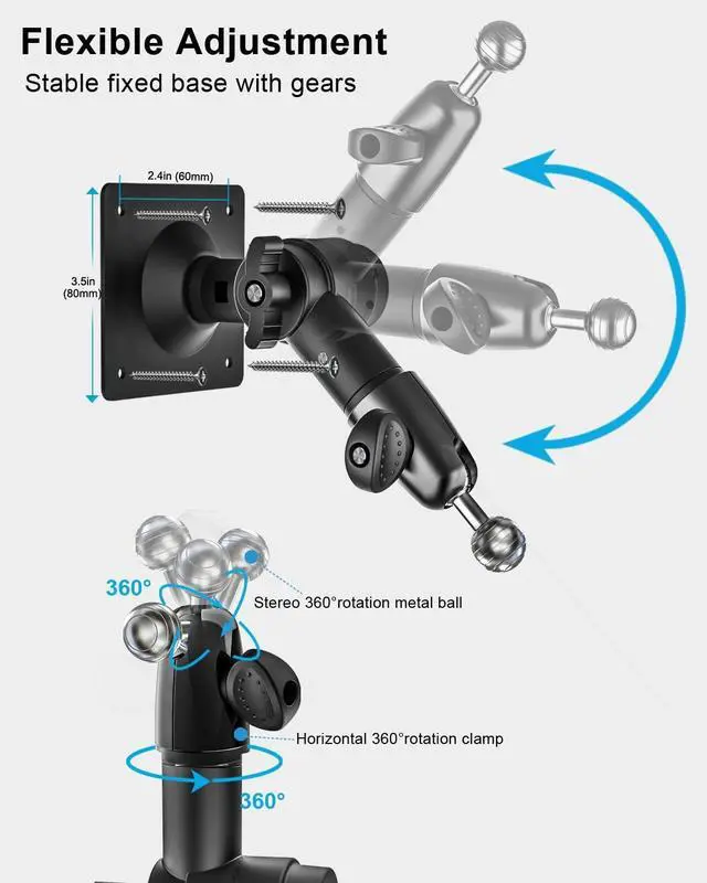 The connector part is a textured bidirectional metal ball joint, wrapped with two zinc alloy clamping arms on the periphery, making the ball joint more stable and non slippery, fully capable of supporting heavy tablet PC. ^^ Flexible AdjustmentThis tablet wall mount is composed of one section durable aluminum alloy arm, that can be 360 degrees rotated due to the two-direction ball joint design. And the arm can be 270 degrees adjusted in arc. When not in use, the arms can be easily adjust untill fit tightly against the wall and free up space.