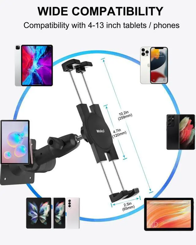 ^^ Wide CompatibilityStretchable bracket of the wall stand fis all 4.7" -13" screen cellphones and tablets, such as compatible with new 2024 iPad Pro 13-in. / 12.9 / 11/ 10.5 / 9.7, iPad Air 6/ 5/ 4, iPad Mini 6/ 5, iPad 10th Generation; Galaxy Tab S, Galaxy Tab A; Fire HD; Surface Pro, Surface Go; Nexus Tablets; Android Tablet PC series; iPhone 16 Pro Max, 15, 14, 13, 12, 11, Xs; Galaxy Z Fold 6/ 5/ 4/ 3/ 2, Galaxy S24 / S23; e-Readers etc more tablets and smartphones with or without a case or sleeve.