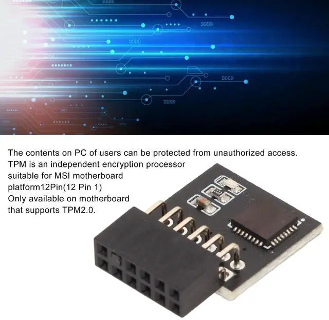 For Motherboard: This TPM 2.0 module is suitable for motherboard platform12Pin (12 Pin 1). Some motherboards require the TPM module to be plugged in or updated to the latest BIOS to enable the TPM option. Only available on motherboard that supports TPM 2.0. 4.