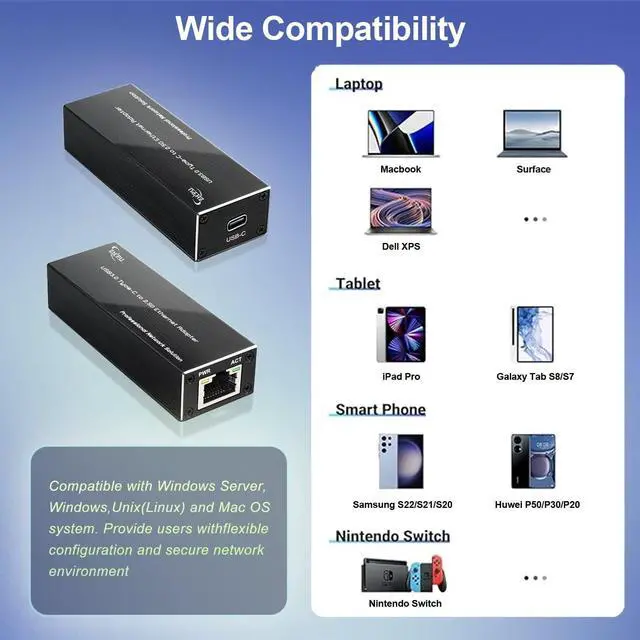 Slow Network: The USB C to ethernet adapter can offer an internet speed of up to 2.5G. By connecting your type-C device to this ethernet adapter, you can bid farewell to network delays from now on. It is also backward-compatible with 1000/100/10Mbps.