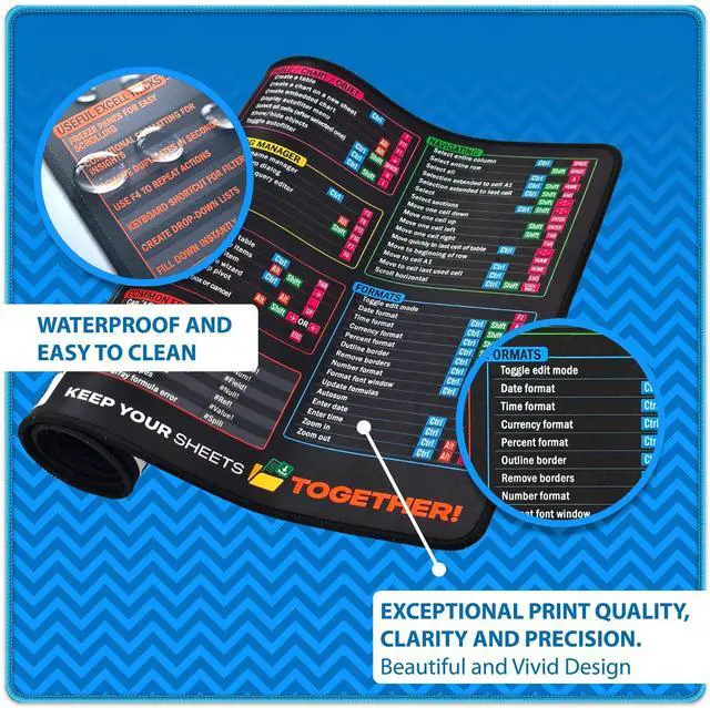 MOST WIDE COMPILATION OF OUR EXCEL SHORTCUT CHEAT SHEET Includes Most Popular And Financial Formulas, Pivot Tables, Error Tips & Excel Hacks. Master Your Workflow And Stay Efficient Every Day. ^^ LARGE SIZE XXL Mouse Pad 35.4" x 15.8" x 0, 11" (900 mm x 400 mm x 3mm) Large Workspace Fits Keyboard And Mouse. Ideal For Office, Home Setup, Or Gaming Use. Smooth And Comfortable Surface. ^^ 03 CORD ORGANIZERS INCLUDED Magnetic cable clips help manage wire, hold your cables and keep your space tidy. Strong adhesive backing lets you stick them securely to your desk, charging station, or any workspace surface.