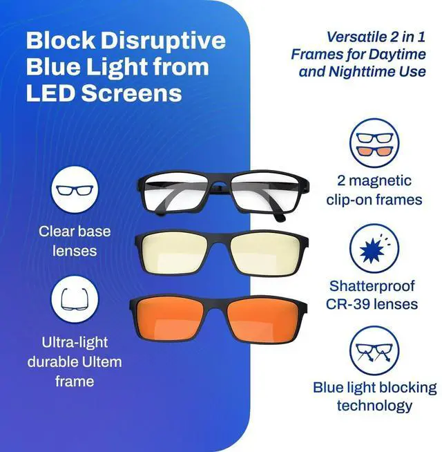 SUPPORT THROUGH LONG SCREEN SESSIONS: Our revolutionary 3-in-1 blue-light glasses are designed for hours on LED screens; these blue blocker glasses include a clear base lens and two clip-on lenses that filter different strengths of high-energy blue light from phones or monitors ^^