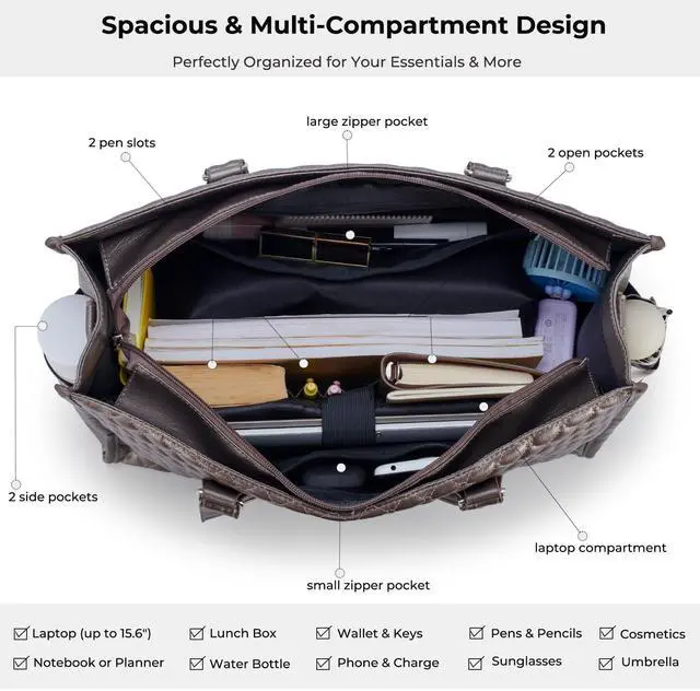 Thoughtful Organized Laptop Bag: Measuring 16.9" x 6.3" x 12.2" (LxWxH), this leather tote bag includes a padded sleeve for laptops up to 15.6 inches, two pen holders, and two open pockets for smaller items like phones or notebooks. Two zippered pockets offer secure storage for valuables, while the PU leather side pockets add convenience for holding water bottles or umbrellas, keeping everything organized and easily accessible ^^ Premium
