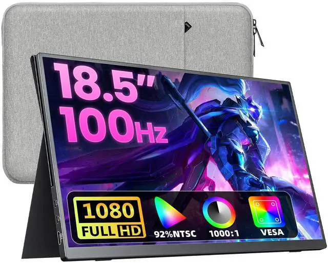 Portable Monitor: this external monitor adopts a 18.5 inch 1080p FHD IPS screen, featuring 130% sRGB (92% NTSC) and 8-bit color depth with 16.7M colors display. This portable gaming monitor with the upgraded 100 Hz high refresh rate has a faster response time and smooth graphics, allowing you to get a head start on your gaming while providing a more comfortable and smooth experience. A sleeve case included with the monitor, so portable ^^ Frameless, Ultra-Slim and