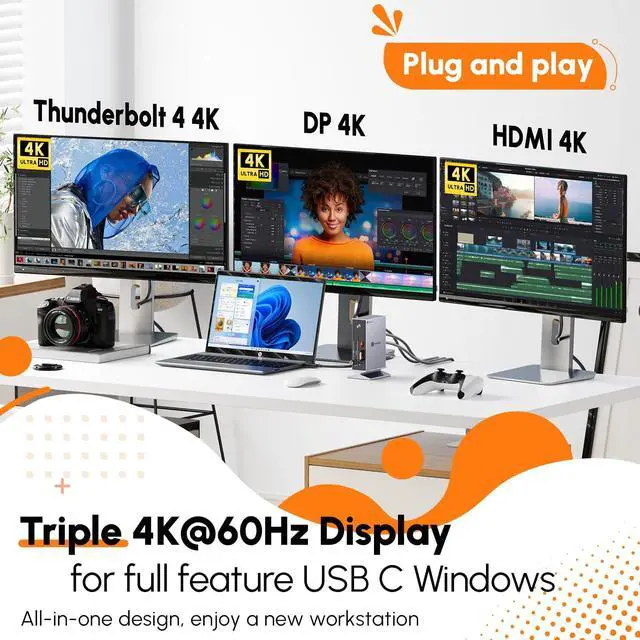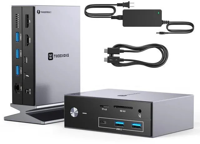 Audio/Mic: With the triple monitor laptop docking station SD 4.0 and TF 4.0 slots, you can conveniently browse photos instantly on your USB-C smartphones/laptops and transfer lots of photos in seconds(up to 362Mb/s) to your laptop, perfect for photographer or designer, video editor, etc. Also, this Thunderbolt 4 computer docking station has a 3.5 mm Mic/Audio port for your wired headset or microphone, so that you can enjoy music without disturbing others ^^ Wide Compatible USB C Docking Station: The TobenONE USB-C triple monitor laptop docking station can extend multiple displays for most full-function USB C/Thunderbolt 3/4 Windows or macOS laptops, such as Dell XPS 13, HP, Lenovo, and MacBook Pro with M1 Pro/M1 Max/M2 Pro/M2 Max/M3 Pro/M3 Max/M4 Pro/M4 Max, etc. Triple display USB C Thunderbolt 4 docking station is plug-and-play and requires no extra drivers, perfect for work-from-home or office environments utilizing both Windows and macOS ^^ Ultra-fast Gigabit