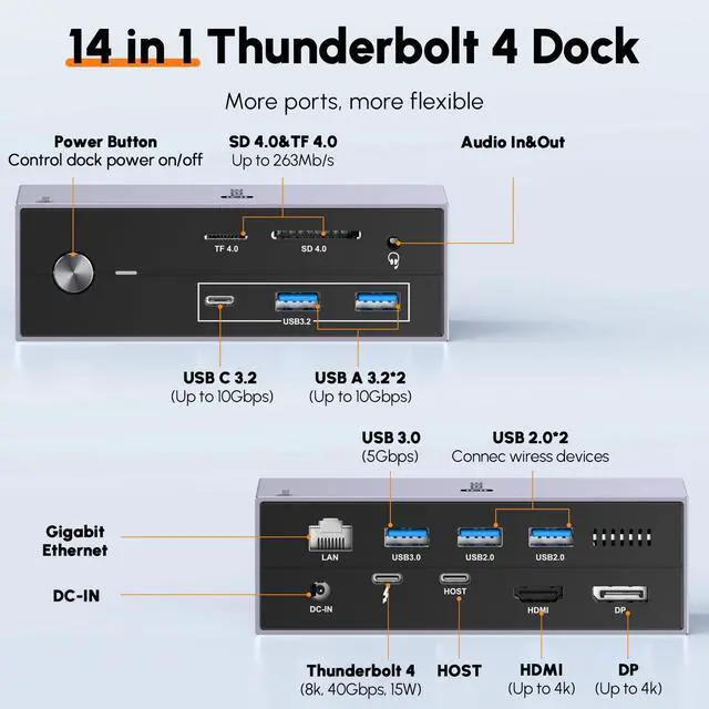Docking Station: The Thunderbolt 4 docking station 3 monitors features an impressive 14 ports, expanding your laptops from one Thunderbolt 4/3/USB 4/full feature USB C to 14 multi-purpose ports. The laptop docking station triple monitor includes Thunderbolt 4 (up to 8K, 40Gbps, 15W charging), DP and HDMI (up to 4K), 3 x USB 3.2 (up to 10 Gbps), SD/TF 4.0 (up to 232 Mbps), 3.5 mm Audio & Mic, RJ45, DC-IN, HOST and a power button, which fully meets your needs in daily life ^^ Single 8K Display for Thunderbolt 4