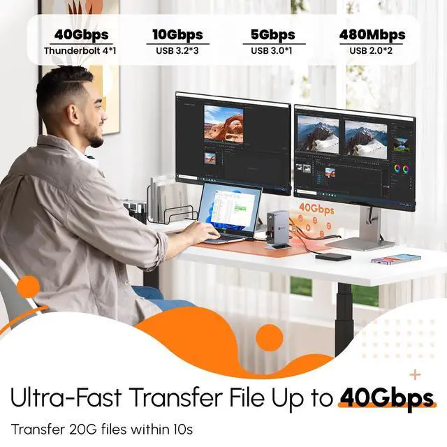 Super-speed Data Transfer Docking Station: Connect to the 1 USB C 3.2 & 2 USB A 3.2 ports of the Thunderbolt 4 to HDMI docking station offering a data transfer speed going up to 10Gbps for tablets, flash drives, and any compatible external storage, the time required to transfer a 20G file just needs about 16.4 s! Coupled with the 40 Gbps Thunderbolt 4 port, you can transfer data between devices at faster speeds. Only takes 10 seconds to transfer a 20G file, perfect for drives and HDD devices ^^ SD/TF 4.0 & 3.5 mm