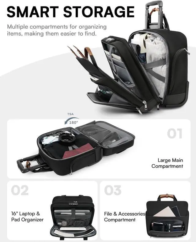 Travel Friendly & Double-compartment LockingThis rolling briefcase features a TSA-friendly lock design, and both the main compartment and the computer compartment can be locked, greatly improving privacy and security. The size of this rolling laptop bag meets the requirements of most airlines and can be placed in the overhead bin or under the seat. Make traveling more convenient and easy! Perfect for those who often need to travel for business or short trips ^^ Large Capacity & Scientific StorageThis mobile office laptop bag has 4 main organizer compartments to accommodate essentials for commuting or business trips while providing smaller compartments designed for different items.