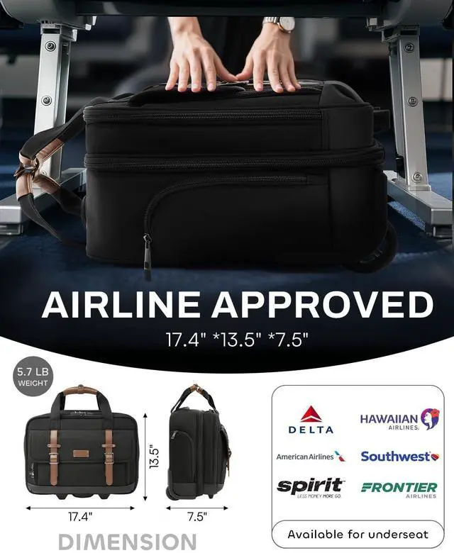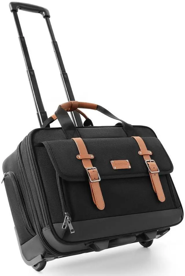 The bottom has carry handles designed to make it easy to lift up. The sturdy, high-quality aluminum telescoping handle is smooth and wobbly to use. The large capacity organizer design can meet the needs of business trips/business trips/short trips/day trips/overnight trips ^^ Combines Stylish Looks with Practical StorageThis computer bag combines a stylish magnetic flap and metal buckle belt design as well as scientifically smart organizer compartments. The dimensions have been optimized so that the rolling bag can be carried on most airlines and can be placed under the seat to keep your personal belongings and computer within easy reach.