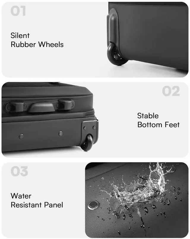The main compartment features a tie-down strap for blankets, lunch boxes, etc. The padded compartment fits a 17 laptop and tablet. The accessory compartment has slots for pens and cards and a file compartment for easy access to files ^^ Great Partner for College and CommutersThe rolling computer bag is made of high quality, wear-resistant silent rubber wheels. Meets the need for quietness in office areas. The carry handle is designed for easy use when walking up and down stairs. The rolling work bag is made of waterproof fabric on the outside as well as PU 900D coated waterproof polyester laminate on the bottom, which prevents rainwater from seeping in and works well in rainy days ^^ Good Travel CompanionThis carry on luggage has a luggage strap on the back for easy transportation on top of luggage.