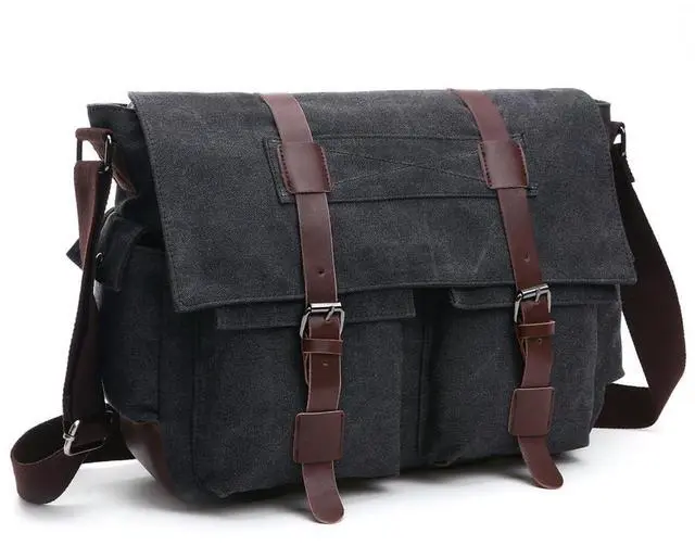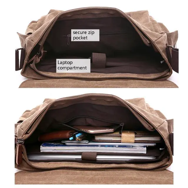 Large Laptop Storage - Fits laptops up to 15.6 inches, documents, and accessories inside a secure main compartment with vintage appeal. ^^ Well-Organized Interior - Features a spacious main zip pocket, two inner slip pockets for phones or chargers, and a zip pocket for valuables. ^^ Multiple External Pockets - Includes a rear zip pocket, two front slip pockets under the flap, and two side pockets for water bottles or accessories. ^^ vintage Canvas - Built from heavy-duty canvas with leather details, offering a classic, timeless, and durable design.