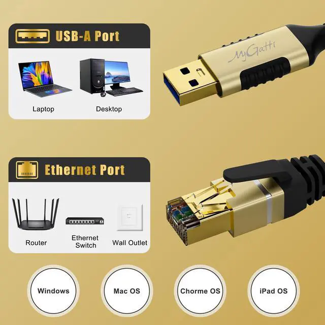 USB A to Ethernet CableHigh quality materialshigh-purity oxygen free copper and internal shielding foiled twisted pairs (FTP). 24K gold-plated connector. Golden yellow and black nylon braided. Speed of up to 1Gbps.