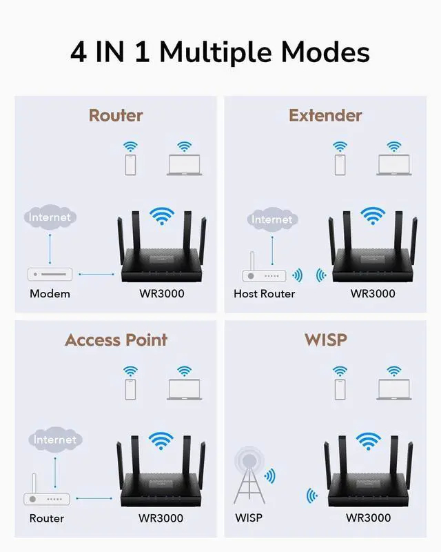 AX3000 dual-band Wi-Fi provides 160MHz bandwidth and 1024-QAM for dramatically faster wireless connections. With a total networking speed of about 3000Mbps WR3000 is 2.5X faster than 802.11 ac 2x2 dual-band routers. ^^ 1.2GH z Dual