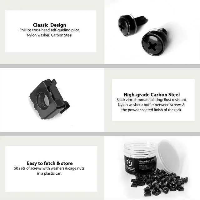 ^^ Screws size: M6 * 16 mm, equals M6 * 0.65 inch; pre-installed nylon washers to prevent scratching equipment; cage nuts are designed for square holes on racks & cabinets usage. ^^ 50 sets in each plastic can. ^^ Zinc chromate plating to prevent rusting, with firm finishing. ^^ Broadly used for standard 19 equipment mounting on cabinets & racks like servers, routers, rack shelves, blank panels, NAS & amplifiers.