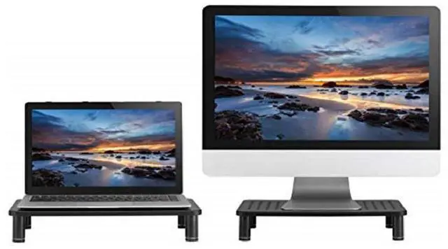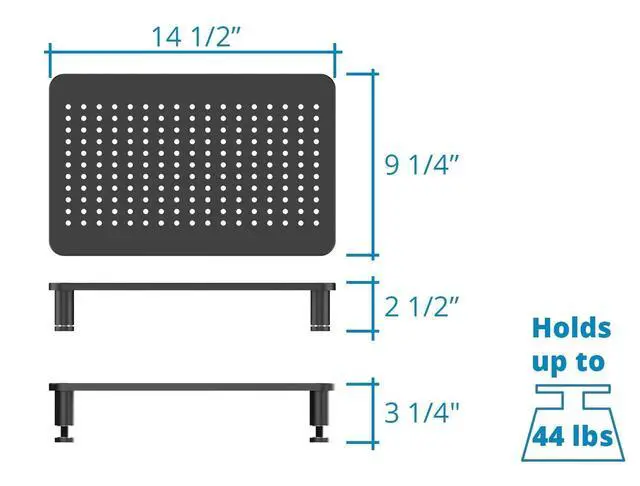 Lift your monitors up to a comfortable level with the Husky Mounts Monitor Laptop Stand Riser! The stand is made from durable matte steel. The top is perforated to allow for air circulation. Legs are adjustable to maximize positive ergonomic usage. ^^ This metal riser can hold up to 44 lbs, and works great as display for computer monitors and/or small television sets. It's tall enough on its own that the space beneath can be used as storage. Two stands can be stacked one on top of the other for efficient use of space.