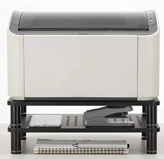 Put an All In One printer copier scanner on top, and reams of paper and replacement cartridges beneath. ^^ Each stand measures 14.5" long and 9.25" wide. There is a clearance of 11.75" between legs. The legs can be adjusted from 2.5" to 3.25" in length. This provides ample space to tuck away a mouse, staplers, tape dispensers and other office supplies. ^^ The legs of this stand are easy to adjust. Just twist the bottoms until you reach the desired length, up to 3.25 inches. If you need more than that, the wide footed legs are stable enough to let you stack one stand on top of another.