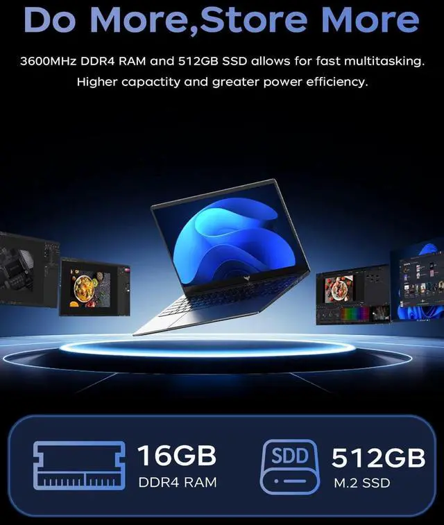 16GB RAM & 512GB ROMEquipped with 16GB of DDR4 RAM and a fast 512GB M.2 SSD, this laptop delivers up to 50% better performance than DDR3 models, ensuring smooth system operation and efficient handling of personal files. With expandable storage optionssupporting a 128GB TF card and upgradable to 2TB SSDyoull never run out of space for your important documents and media.