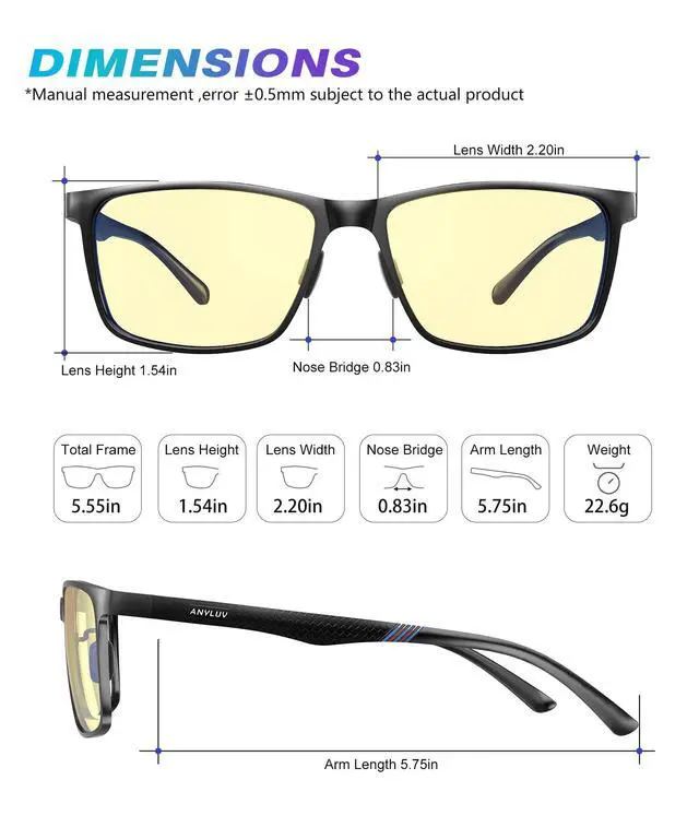AL-MG design: The womens blue light glasses are made of aluminum-magnesium alloy for excellent durability and lightness. The choice of material makes the blue light glasses for women more durable. It also ensures the lightness of the glasses. The best rated blue light glasses is also resistant to oxidation and abrasion, extending the life of the product and allowing you to enjoy the protection of your blue light glasses for men for a long time ^^