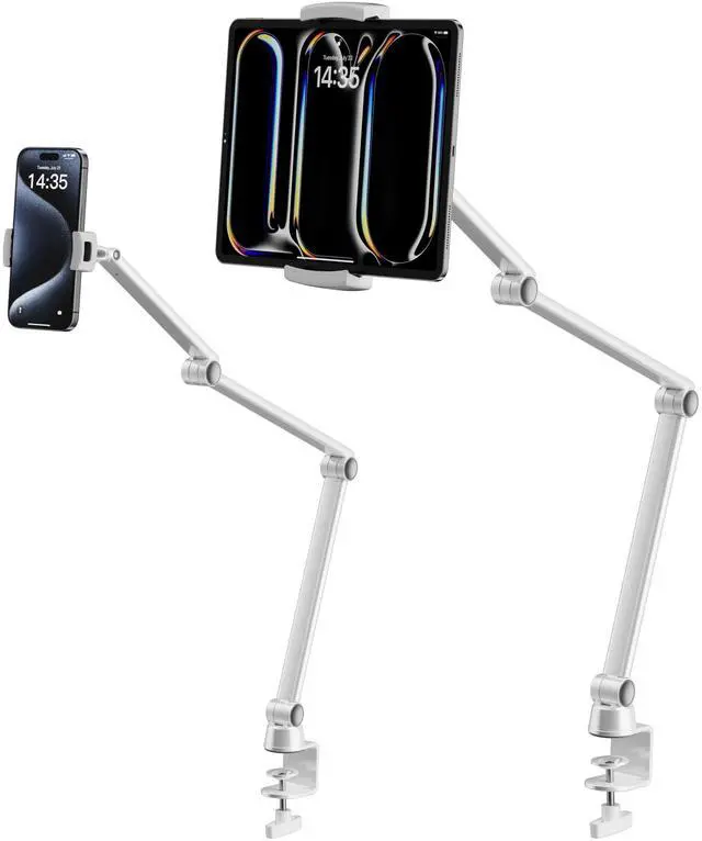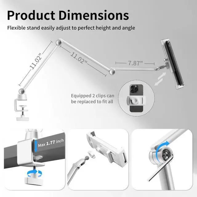 With a rubber pad on the clip, it prevents furniture from being scratched. The total length of the desk iPad stand is 39.76 inches, consisting of three tablet arm parts, with each part measuring 11.02 inches. The solid support arm features a sturdy rectangular column design that is unlikely to break, satisfying the needs of most users ^^ [Wide Compatibility] This ipad mini stand has two retractable clips (1* tablet clip, 1* mobile phone clip). The clips allow devices to be used without removing their cases. It is compatible with phones and tablets from 4.7 to 13 inch, including the new iPad Pro 11/ 12.92024 /2023/2022/2021/2020, iPad Pro 9.7 / 10.5 /13, iPad Mini 6/5/4/3, iPad 5th/6th/7th/8th/9th/10th generation, iPhone 16 pro/15 /Plus/Pro/Pro Max, iPhone 14 /Plus/Pro/Pro Max, 13 Pro Max, 12/11 Pro Max, iPhone Xs Max, Galaxy Tab S9, S8, S7, A8, A7, Kindle Fire HD 7/8/10, Pixel, Nexus, E-reader, Surface Pro, and Switch, etc